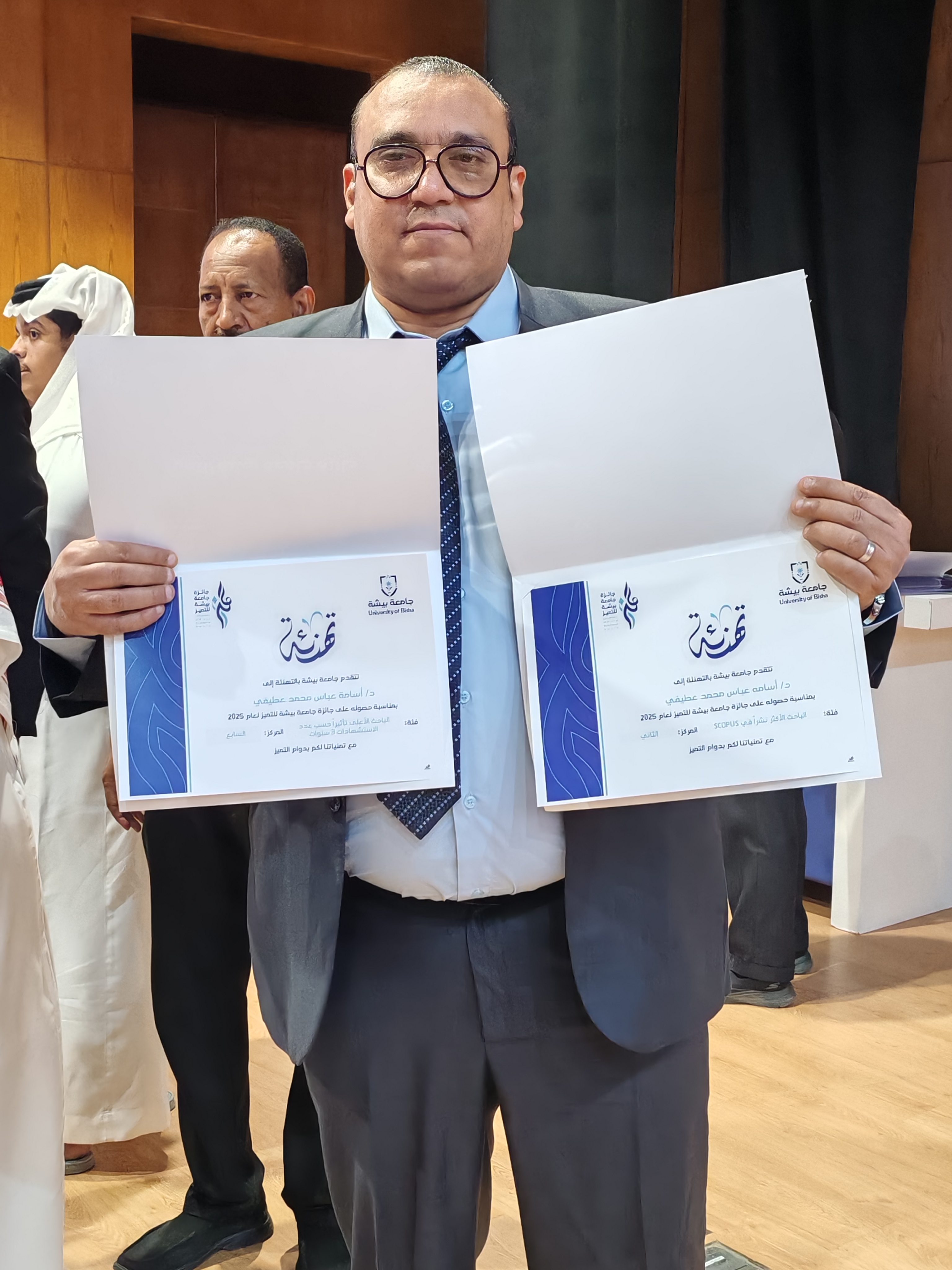 تقديرا لجهوده المميزة في مجال البحث العلمي، حصل د. أسامة عباس على المركز الثاني لجائزة التميز من جامعة بيشة للباحث الأكثر نشرا في المجلات التابعة لدورية سكوبس والمركز السابع للأكثر استشهادا لأوراقه العلمية في آخر 3 سنوات وذلك خلال الحفل السنوي للجامعة والذي أقيم بمسرح الإبداع بمقر جامعة بيشة. ...