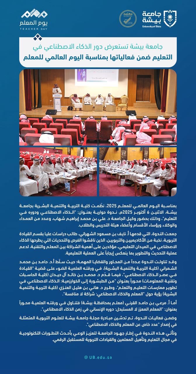 On the occasion of World Teachers' Day 2025, the College of Education and Human Development at Bisha University organized, on Monday, October 6, 2025, a dialogue seminar entitled "Artificial Intelligence and its Role in Education." The seminar was attended by the University Vice President, Dr. Ali bin Muhammad Ibrahim Shihab, a number of deans, vice presidents, department heads, faculty members, and students....